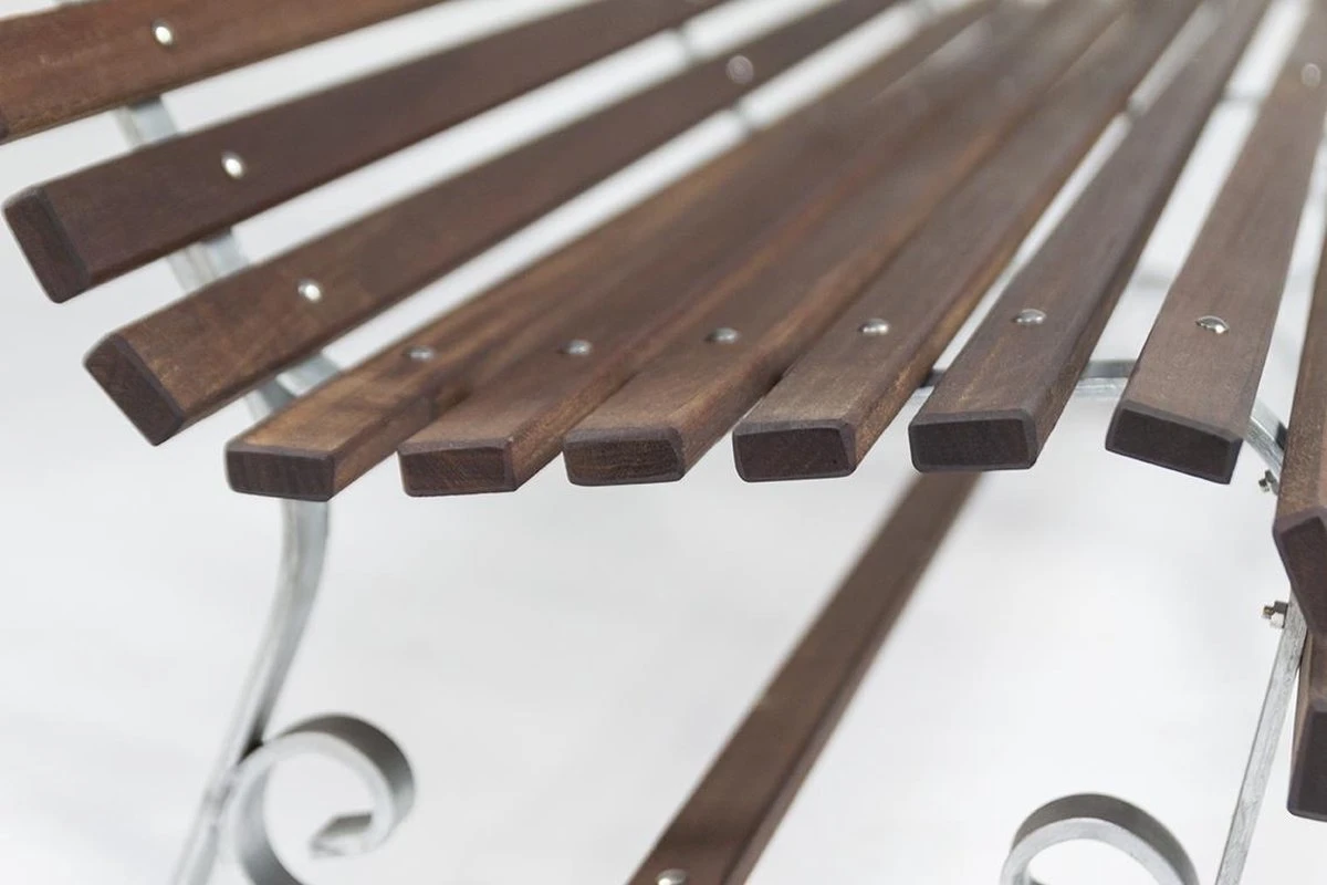 De tuinbank is verstevigd met een stalen onderstel bestaand uit een 10 x 30 mm thermisch verzinkte strip met voorgeboorde gaten voor eventuele grondverankering. Het onderstel van de tuinbank is verzekerd met slotbouten uit roestvrij staal.